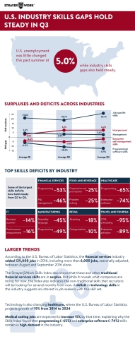 WASHINGTON--(BUSINESS WIRE)--Skills gaps in key U.S. industries held steady over the summer, according to the latest Strayer@Work Skills Index, similarly the U.S. unemployment rate was little changed at 5.0 percent. Programming and enterprise software skills continued to show gaps across all seven sectors analyzed in the quarterly index, which is based on an analysis of select data provided by LinkedIn.